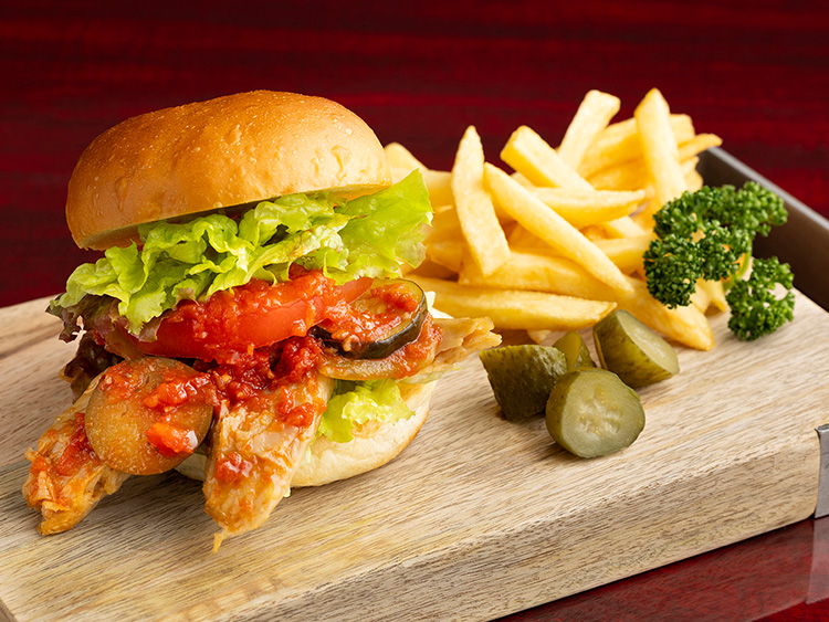 まるで鶏肉のような食感の大豆ミートをラタトゥイユと一緒にサンドしたヘルシーバーガーです。